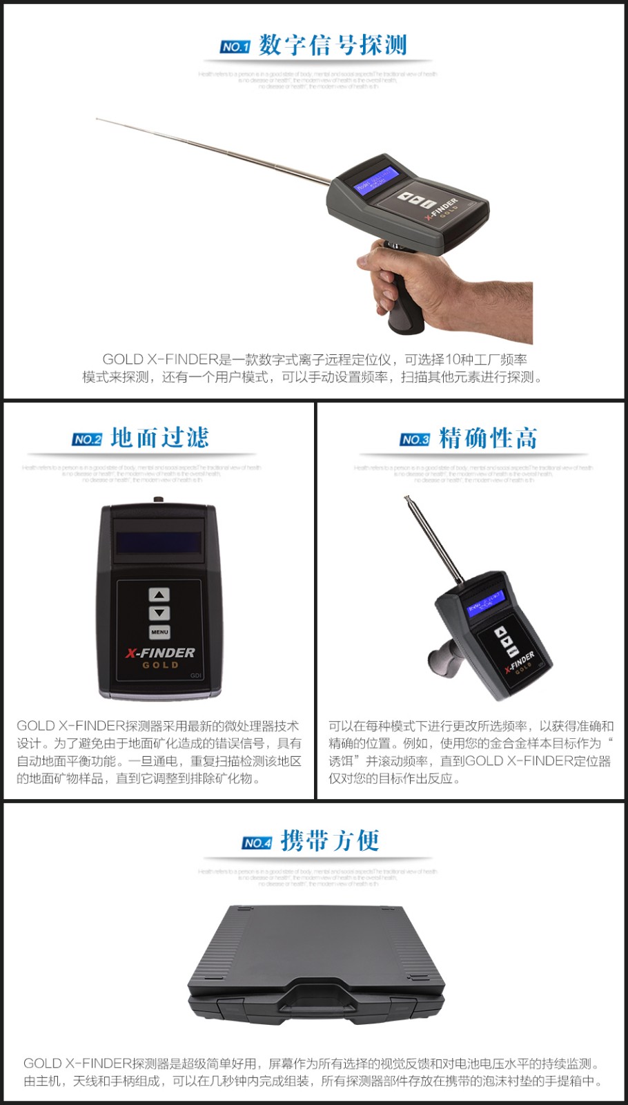 GOLD X-FINDER探測器是超級簡單好用,屏幕作為所有選擇的視覺反饋和對電池電壓水平的持續(xù)監(jiān)測。GOLD X-FINDER遠(yuǎn)程定位儀由主機(jī),天線和手柄組成,可以在幾秒鐘內(nèi)完成組裝,所有探測器部件存放在攜帶的泡沫襯墊的手提箱中。
