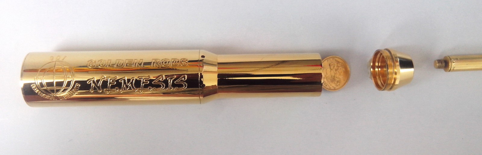Το 提高目標選擇性 NEMESIS 具有樣品室NEMESIS 棒的用戶將他們在隔間內尋找的材料的一個小樣本或多個樣本組合插入。這就是 NEMESIS 被調整來搜索包含相同類型材料的特定寶藏的方式。例如,當尋找黃金時,將金塊插入樣品室。您可以使用 NEMESIS 棒來尋找金、銀、汞、鉛、銅、鉆石、石油、水或其他物質。樣品室后面是NEMESIS動力管,其中使用少量特殊的放射性礦石來刺激其晶體,以放大來自遠處目標的微弱吸引力,否則這些目標將超出競爭對手的遠程定位器的范圍。